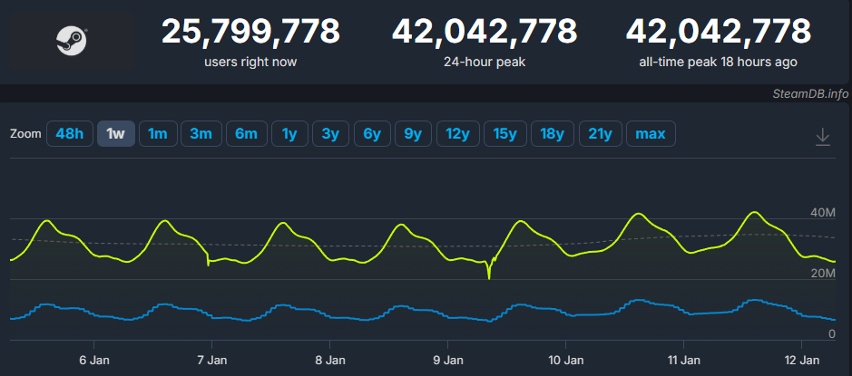 The peak online user count on Steam has surpassed 42 million.