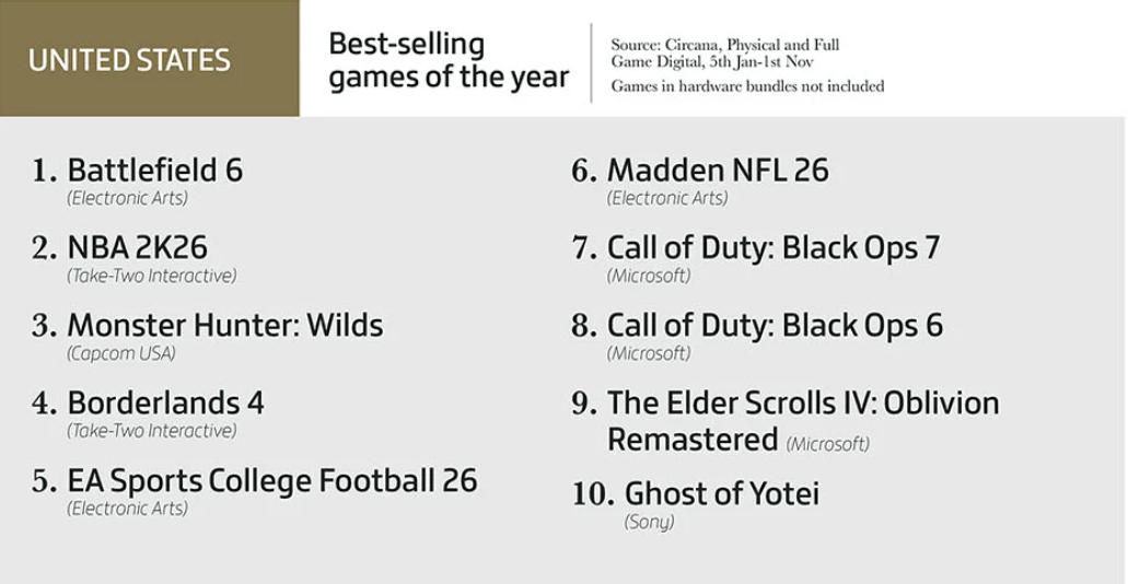 - В США самой продаваемой игрой для консолей и ПК по итогам января-ноября 2025-го стала Battlefield 6. Вместе с ней в топ-5 вошли NBA 2K26, Monster Hunter Wilds, Borderlands 4 и EA Sports College Football 26. Отметим, что в американской статистике не учитывались продажи игр в составе бандлов с консолями, отчасти поэтому в ней нет Mario Kart World.