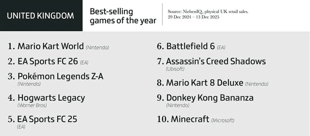 - В Великобритании лучшие продажи в период с 29 декабря 2024-го по 13 декабря 2025-го показала как раз Mario Kart World. Далее в топе идут EA Sports FC 26, Pokémon Legends: Z-A, Hogwarts Legacy и EA Sports FC 25. Важно: в Великобритании аналитики считали только физические продажи игр.