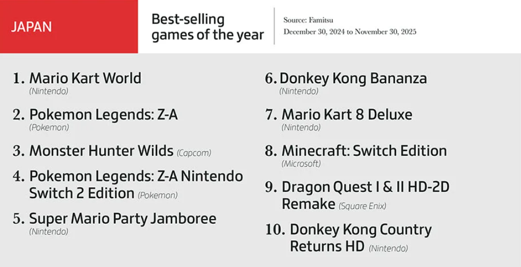 - Главными бестселлерами в Японии в период с 30 декабря 2024-го по 30 ноября 2025-го стали Mario Kart World, Pokémon Legends: Z-A, Monster Hunter Wilds, Pokémon Legends: Z-A – Nintendo Switch 2 Edition и Super Mario Party Jamboree.