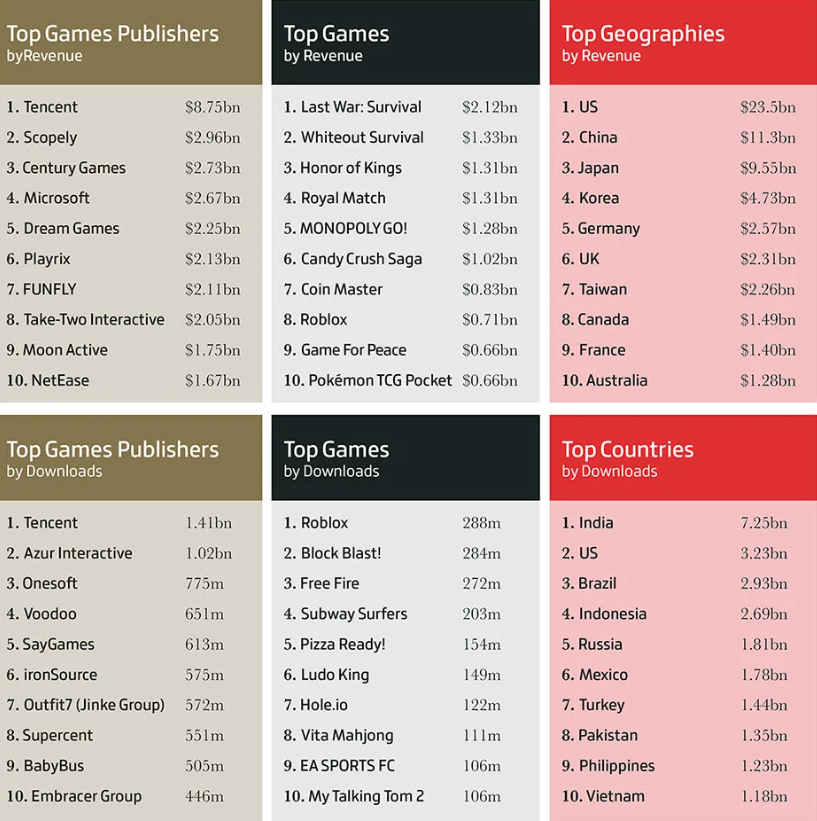 - Топ-3 издателей мобильных игр по кассе: Tencent (8,75 млрд долларов), Scopely (2,96 млрд долларов) и Century Games (2,73 млрд долларов).