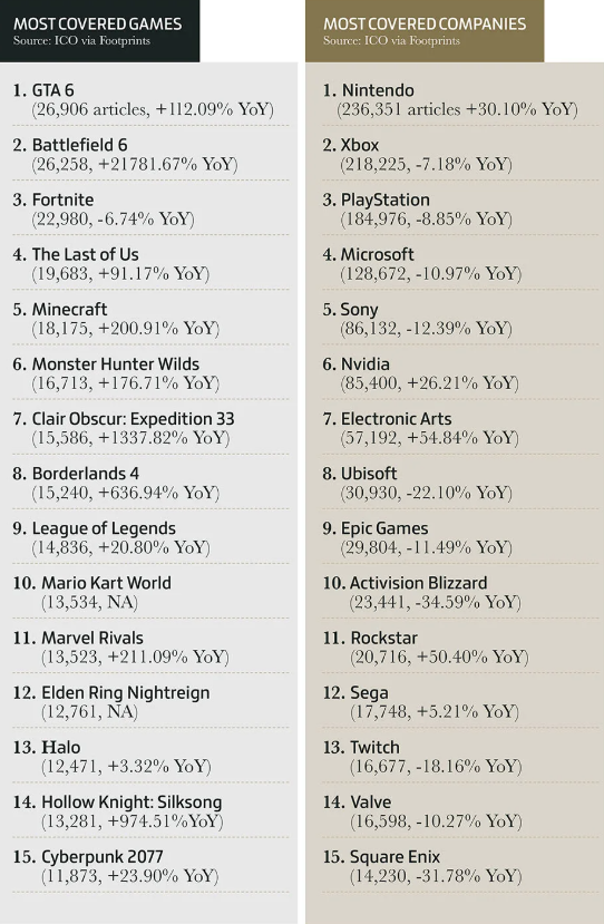 - Больше всего в 2025 году западные СМИ писали о GTA VI, Battlefield 6 и Fortnite — о каждой игре вышло более 20 тысяч публикаций. Из компаний чаще всего в прессе упоминали Nintendo, Xbox и PlayStation.