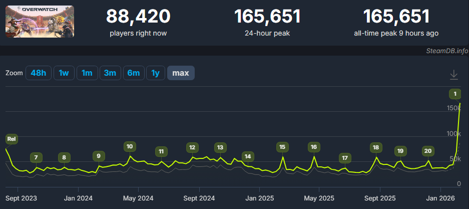 根据SteamDB的数据,2月10日晚间,《守望先锋》在Valve商店的在线峰值达到165,651人。这是自游戏在该平台上线以来的最佳成绩。相比之下,早前的最高在线人数为75,608人,是2023年8月《守望先锋》首次在Steam亮相时创下的。
